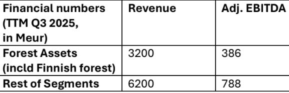 In September 2025, Stora Enso sold 12.4% of its Swedish forest holdings for 900M euro [2]. This means that the implied market value of the remaining 87.6% Swedish forest holdings that are going to be spun-off is 6.36B euro instead of the fair value of 5.7B euro.
